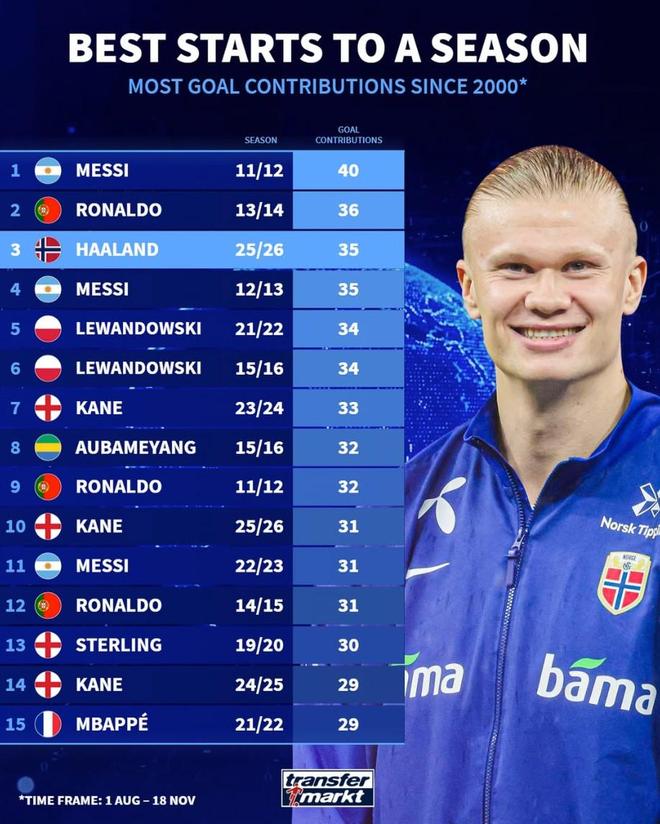 北京时间11月19日,来自德转的统计指出,哈兰德本赛季至今代表挪威国家队和曼城一共直接参与了35粒进球,自2000年以来,这一数据在赛季同期能够排在并列第三位,仅次于2011-12赛季的梅西以及2013-14赛季的C罗。